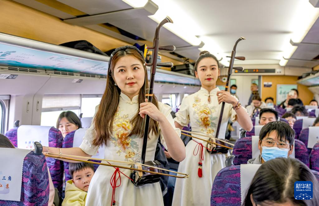 3月29日,揚(yáng)州市文藝工作者在“水韻江蘇”主題旅游列車(chē)上進(jìn)行二胡演奏。
