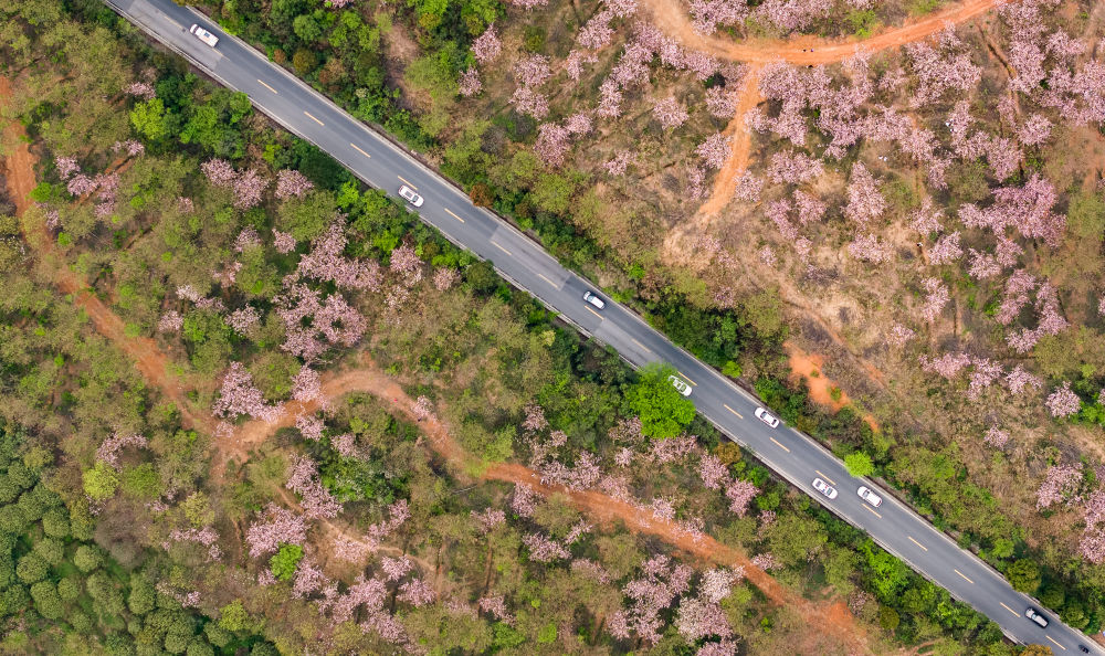 游客驅車前來清鎮(zhèn)市紅楓湖鎮(zhèn)右二村踏青游玩(4月5日攝,無人機照片)。新華社記者 陶亮 攝
