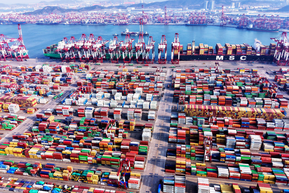 這是2月23日拍攝的山東港口青島港外貿(mào)集裝箱碼頭(無人機(jī)照片)。2025年以來,青島港開通2條到東南亞、地中海方向的“一帶一路”航線,合計(jì)新開4條國(guó)際集裝箱航線,加快世界一流海洋港口建設(shè)。新華社發(fā)(俞方平 攝)