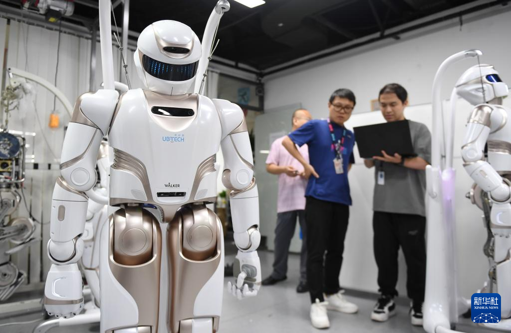 2024年6月26日,在位于深圳市南山智園的優(yōu)必選總部,工作人員對人形機器人進行測試。新華社記者毛思倩 攝