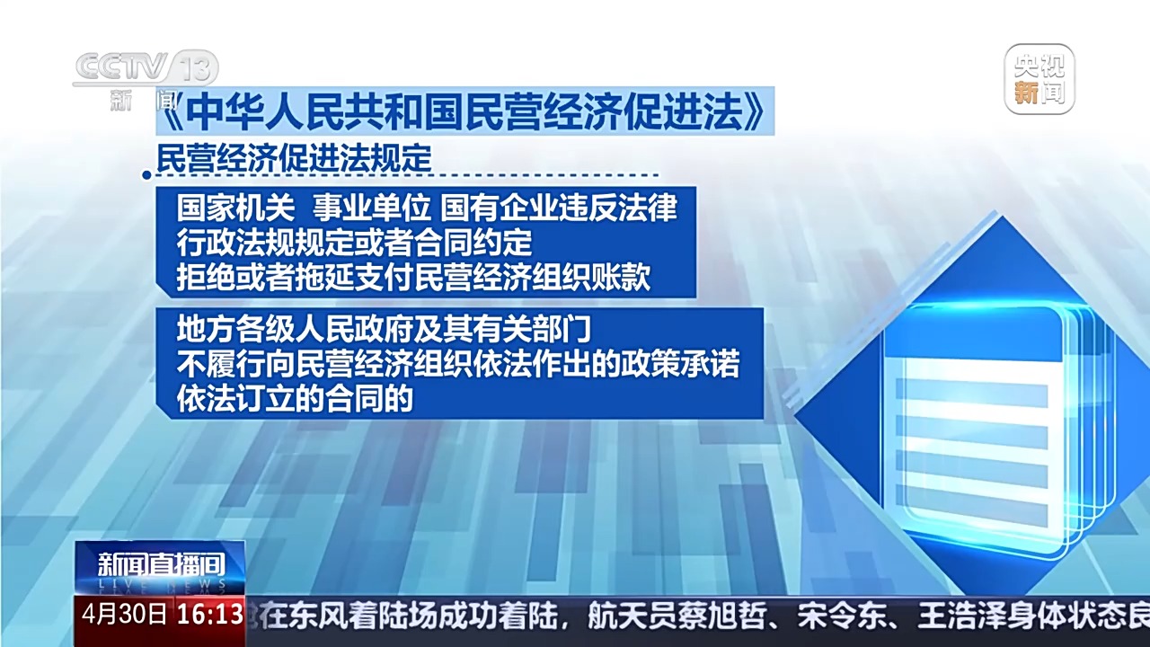 另外,民營經濟促進法規(guī)定,國家機關、事業(yè)單位、國有企業(yè)違反法律、行政法規(guī)規(guī)定或者合同約定,拒絕或者拖延支付民營經濟組織賬款,地方各級人民政府及其有關部門不履行向民營經濟組織依法作出的政策承諾、依法訂立的合同的,由有權機關予以糾正,造成損失的,依法予以賠償;造成不良后果或者影響的,對負有責任的領導人員和直接責任人員依法給予處分。