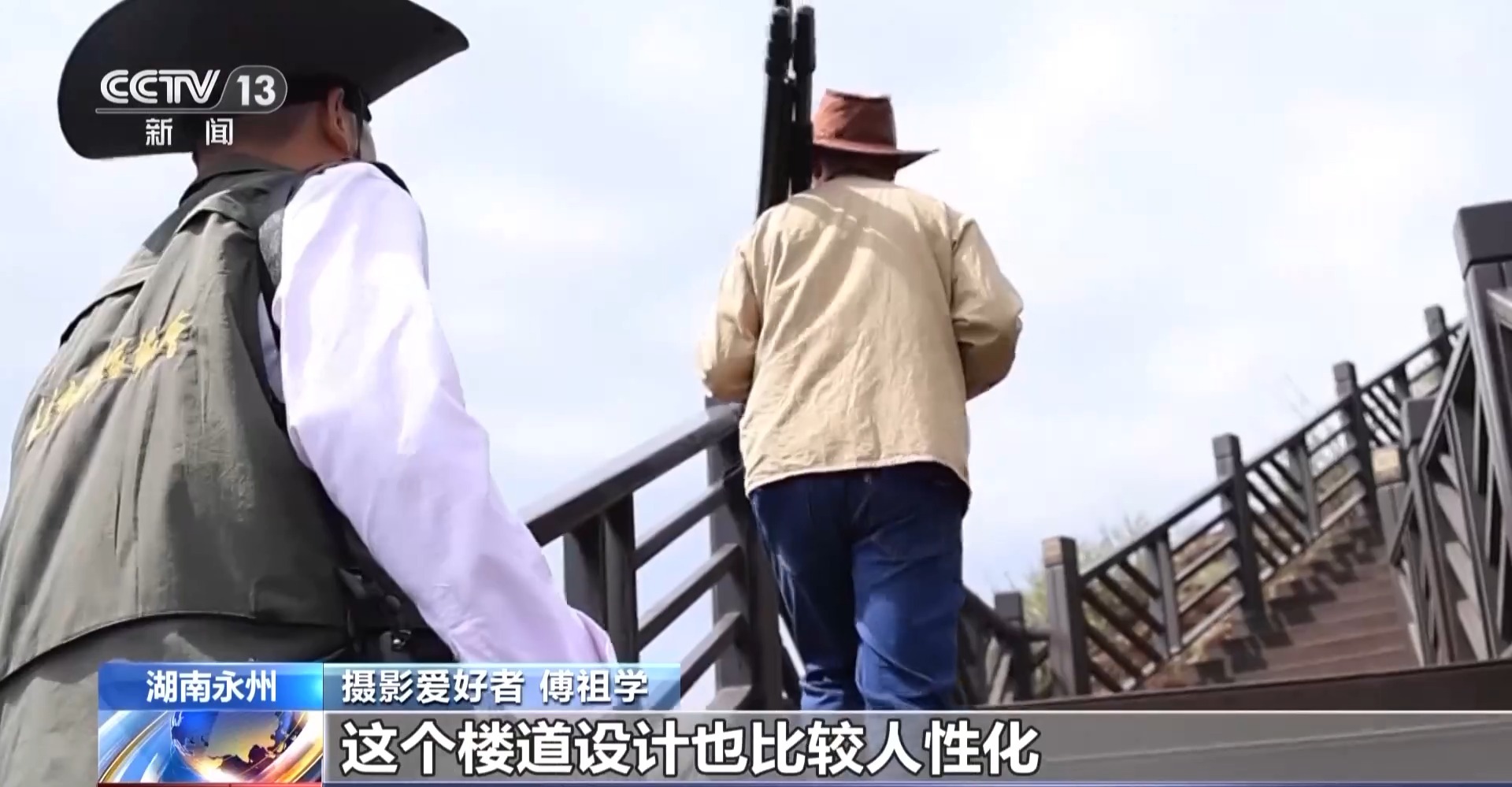 攝影愛好者 傅祖學:我們在觀鳥之余,還可以順著樓道爬到山頂看風景,這個樓道設計也比較人性化,每隔幾十米就有一個休憩的平臺,爬累了就休息一會兒。