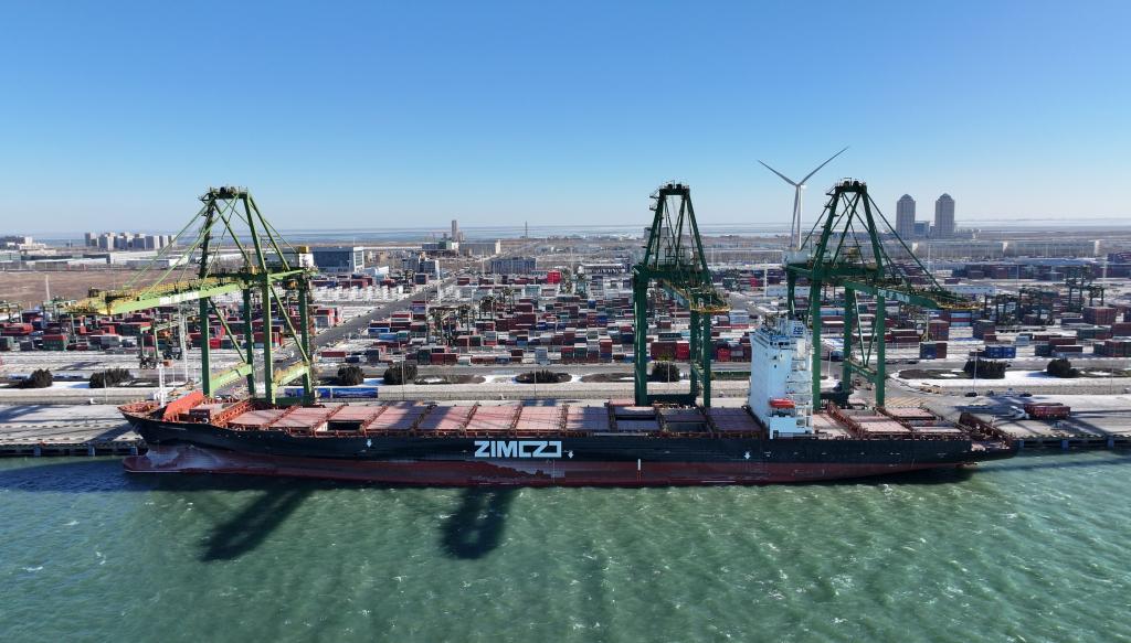 2023年12月21日,“羅安達輪”集裝箱船靠泊在天津港(無人機照片)。當(dāng)日,“羅安達輪”集裝箱船正式從天津港出發(fā),駛向哥倫比亞、厄瓜多爾、秘魯、智利等南美洲國家,標(biāo)志著天津港正式開通天津—南美西新航線。新華社記者 趙子碩 攝