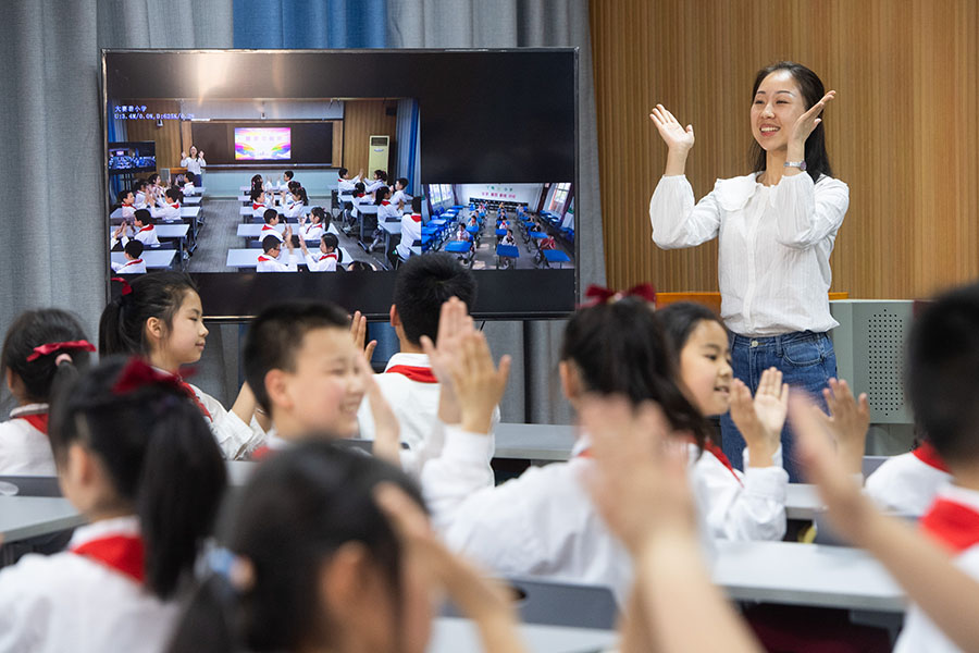 2022年5月16日,在湖北省荊州市沙市大賽巷小學,學生通過“空中課堂”與偏遠鄉(xiāng)鎮(zhèn)的丫角小學一起進行韻律操活動。 新華社記者 肖藝九 攝