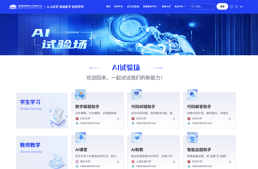 與時俱進,今年,國家智慧教育公共服務(wù)平臺掌握了“新能力”。人工智能(AI)試驗場上,數(shù)字解題助手、代碼糾錯助手、代碼解答助手賦能學生學習;AI課堂、AI助教、智能出題助手賦能教師教學;大模型、信息科技平臺賦能科學研究……