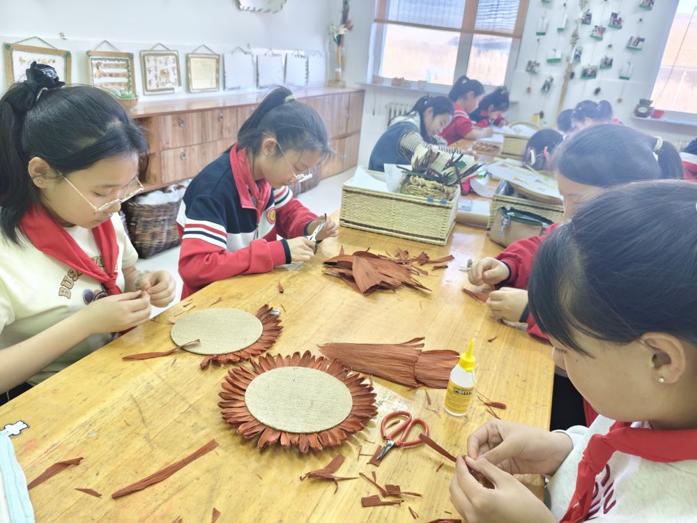 統(tǒng)部小學有一片十余畝的勞動試驗田,種滿了玉米。每到秋收時節(jié),任慧敏就帶著同學們到田里收集玉米皮,曬干加工成做手工的材料。任慧敏說:“學校開設了玉米皮粘貼畫社團課程,用農(nóng)村隨處可見的玉米皮制作粘貼畫,很受學生們歡迎?!?/p>