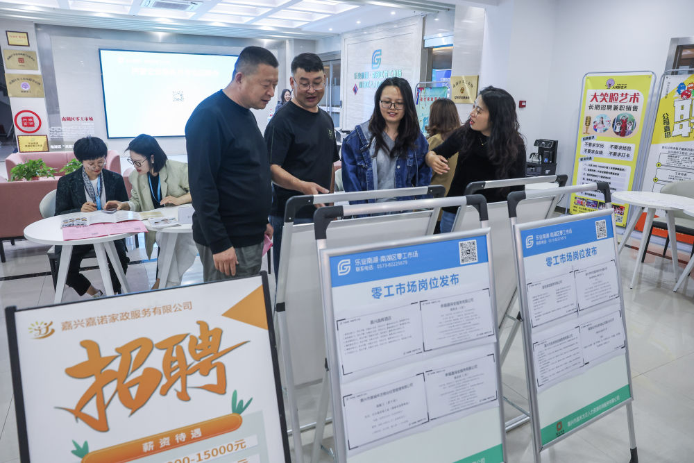 5月8日,在浙江省嘉興市南湖區(qū)零工市場(chǎng)的一場(chǎng)零工招聘會(huì)上,求職者查看各類(lèi)崗位。新華社記者 徐昱 攝