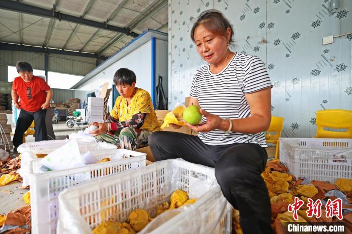李冬英(右一)和社員一起處理剛采摘下來的砂梨。董曉斌 攝
