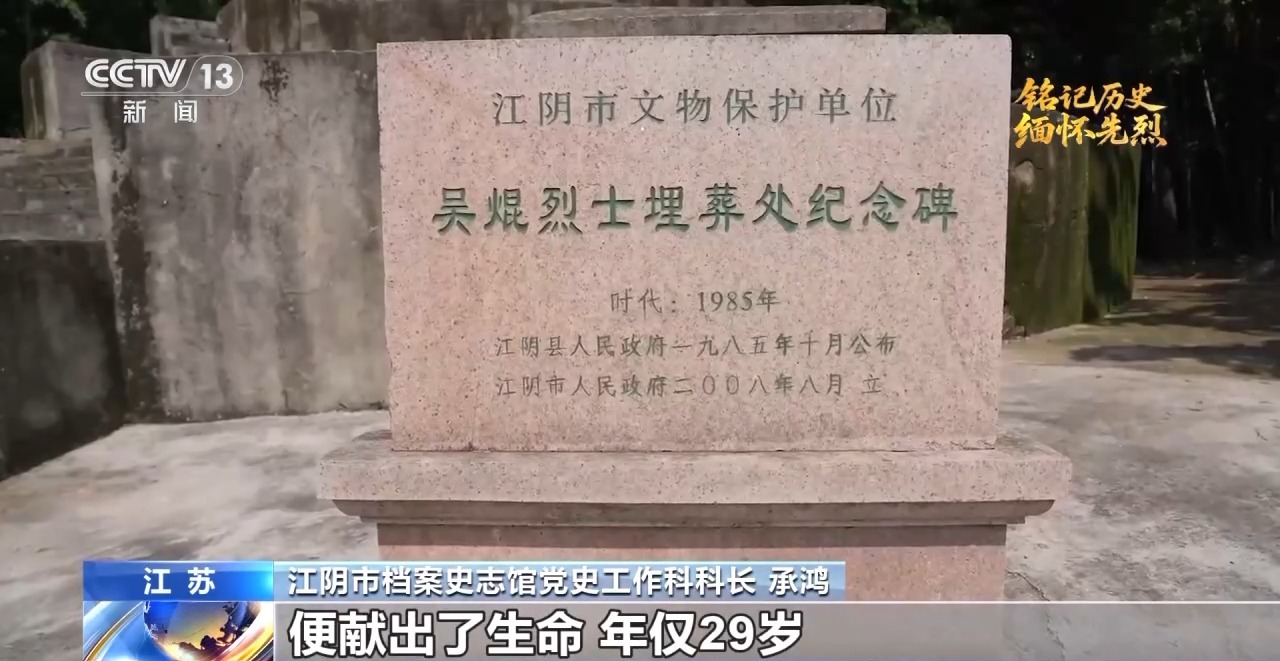 江陰市檔案史志館黨史工作科科長 承鴻:他率領(lǐng)部隊(duì)進(jìn)軍的時(shí)候,遭到了國民黨軍隊(duì)的冷槍,吳焜頭部中彈,未及留下只言片語,便獻(xiàn)出了生命,年僅29歲。吳焜參加過長征,歷經(jīng)艱難險(xiǎn)阻,在作戰(zhàn)和訓(xùn)練當(dāng)中,處處以身作則,率先垂范。他指揮作戰(zhàn)時(shí)經(jīng)常沖在第一線,非常勇猛,正是依靠這種精神和作風(fēng),讓新四軍成為鐵軍。