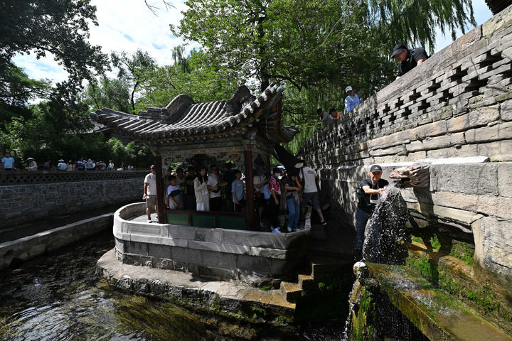 2025年8月7日,游客在晉祠難老泉排隊(duì)觀泉。新華社記者 詹彥 攝