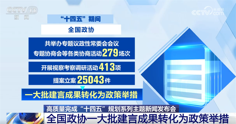“十四五”期間,全國政協(xié)共舉辦專題議政性常委會(huì)會(huì)議、專題協(xié)商會(huì)等各類協(xié)商活動(dòng)279場(chǎng)次,開展視察考察調(diào)研活動(dòng)413項(xiàng),提案立案25043件,一大批建言成果轉(zhuǎn)化為政策舉措。