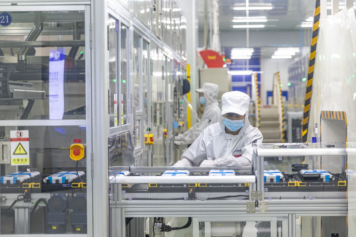 2024年9月27日,在位于重慶市銅梁區(qū)的海辰儲(chǔ)能重慶制造基地,工作人員在生產(chǎn)線(xiàn)上初步檢測(cè)兩個(gè)電芯是否配對(duì)。