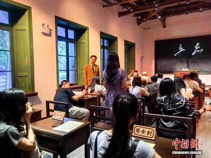 9月5日,位于長(zhǎng)沙橘子洲的《恰同學(xué)少年》沉浸式青春劇場(chǎng),“楊昌濟(jì)”飾演者與觀(guān)眾王子悅(紫衣)互動(dòng)?!堁┯?攝