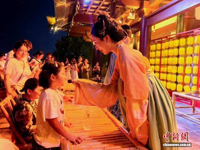 9月5日,長(zhǎng)沙杜甫江閣“喜相逢”唐風(fēng)互動(dòng)夜游活動(dòng)中,演員正在與觀(guān)眾互動(dòng)。張雪盈 攝