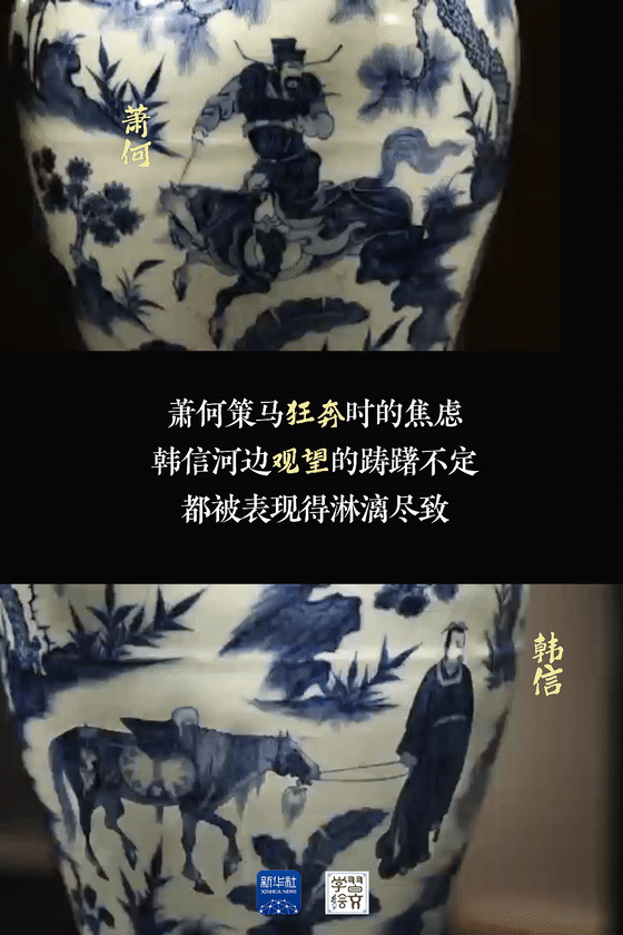 “元代是中國陶瓷史上不容忽視的重要時期?!彼窝嘟榻B,這件藏于南京市博物館的元青花蕭何月下追韓信圖梅瓶向人們展示了元代制瓷水平。