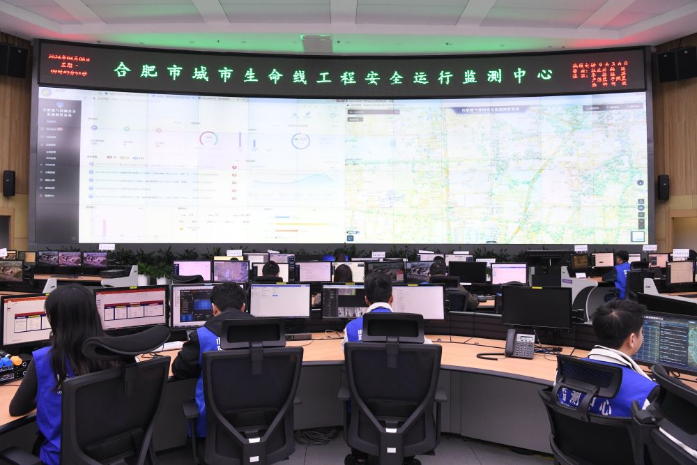 技術(shù)人員在位于清華大學(xué)合肥公共安全研究院的合肥市城市生命線(xiàn)工程安全運(yùn)行監(jiān)測(cè)中心值守(2024年4月8日攝)。合肥市2015年啟動(dòng)城市生命線(xiàn)安全工程建設(shè),逐步構(gòu)建燃?xì)?、橋梁、供水、排水、熱力、綜合管廊、消防、水環(huán)境八大領(lǐng)域立體化監(jiān)測(cè)網(wǎng),探索出一條以場(chǎng)景應(yīng)用為依托、以智慧防控為導(dǎo)向、以創(chuàng)新驅(qū)動(dòng)為內(nèi)核、以市場(chǎng)運(yùn)作為抓手的城市安全發(fā)展新模式。