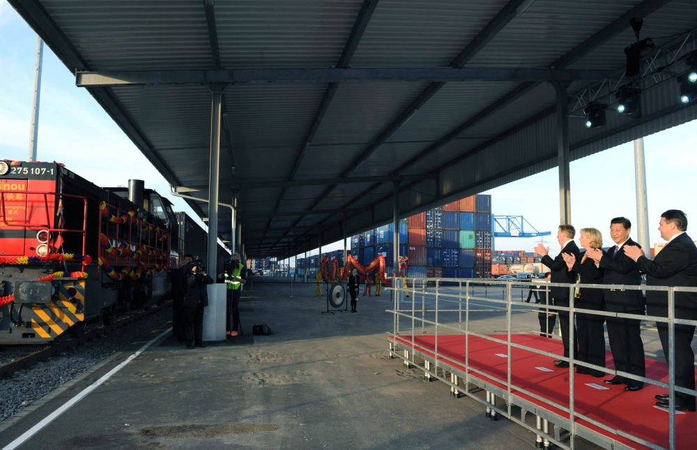 2014年3月29日,德國杜伊斯堡港?!坝逍職W”國際鐵路聯(lián)運大通道的終點。中國國家主席習近平來到這里。三聲鑼響后,從中國重慶始發(fā)的列車滿載著貨物緩緩駛入。新華社記者 饒愛民 攝