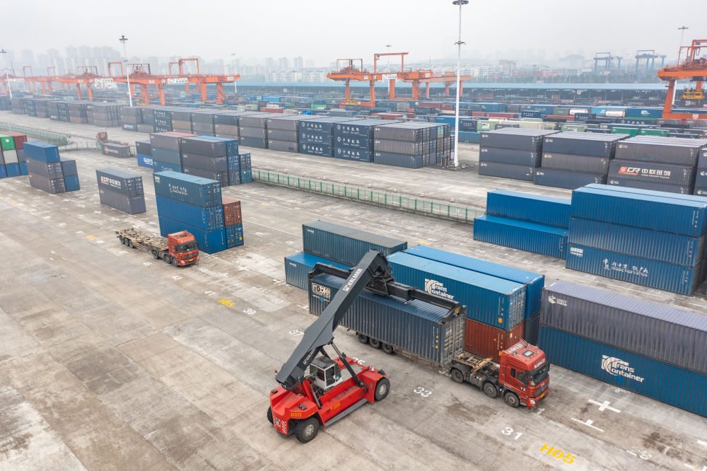 3月7日,在重慶團結村中心站的海關監(jiān)管區(qū),工作人員將通過中歐班列發(fā)運的貨物清關后裝上貨車運往編組站進行編組(無人機照片)。新華社記者 黃偉 攝