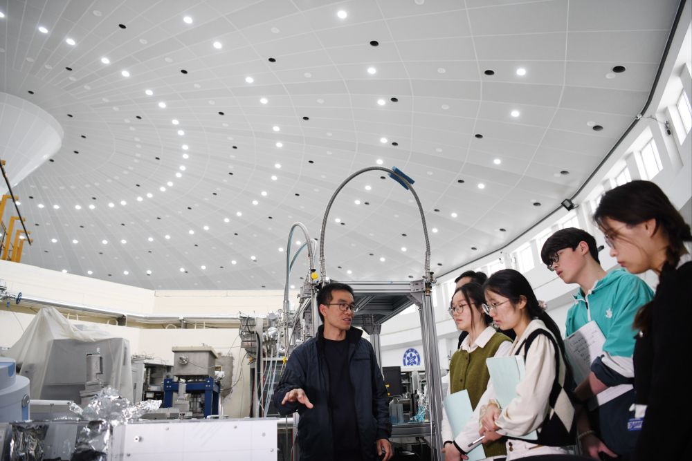 在中國科學技術(shù)大學國家同步輻射實驗室,安徽省先進功能高分子薄膜工程實驗室團隊成員崔昆朋教授(左一)同學生交流(2024年4月6日攝)。新華社記者 張端 攝