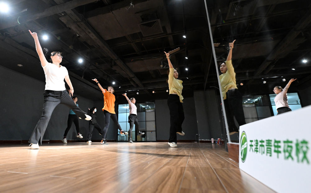 在天津青年宮,學員在青年夜校練習有氧健身舞(2024年4月23日攝)?!⌒氯A社記者 趙子碩 攝