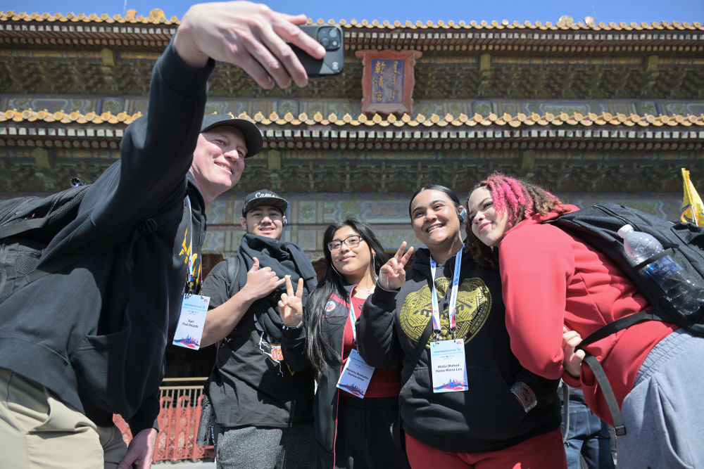 2024年3月19日,美國(guó)華盛頓州中學(xué)生代表團(tuán)的成員在故宮乾清宮前合影留念。 新華社記者 李鑫 攝