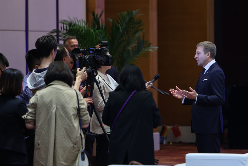 2024年4月26日,遼寧省沈陽市與寶馬集團(tuán)深化戰(zhàn)略合作簽約儀式在沈陽舉行,這是寶馬集團(tuán)董事長(zhǎng)齊普策接受采訪?! ⌒氯A社記者 潘昱龍 攝