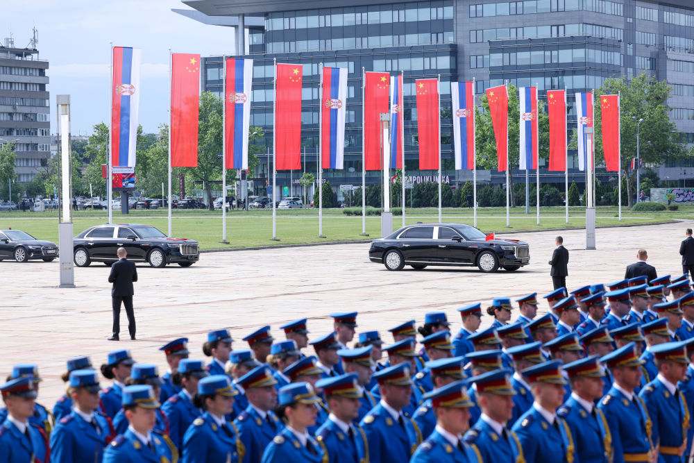 塞爾維亞大廈前,中塞兩國國旗迎風飄揚,儀仗隊威武雄壯。