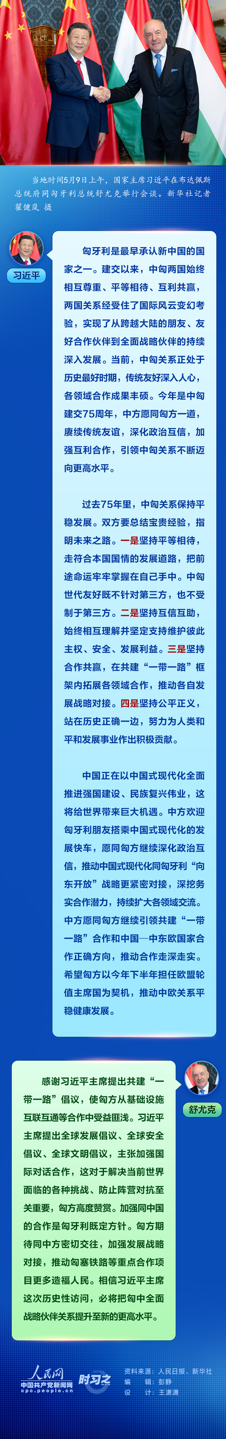 當(dāng)?shù)貢r間5月9日上午,國家主席習(xí)近平在布達(dá)佩斯總統(tǒng)府同匈牙利總統(tǒng)舒尤克舉行會談。習(xí)近平指出,今年是中匈建交75周年,中方愿同匈方一道,賡續(xù)傳統(tǒng)友誼,深化政治互信,加強(qiáng)互利合作,引領(lǐng)中匈關(guān)系不斷邁向更高水平。
