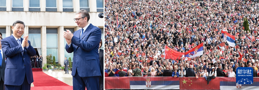 會談前,塞爾維亞總統(tǒng)武契奇陪同習(xí)近平主席來到大廈平臺。此時,平臺外的大廈廣場上,友誼的海洋沸騰起來——一萬五千名當?shù)孛癖姄]舞中塞兩國國旗,齊聲呼喊兩國國名,對遠道而來的貴客表示最熱烈的歡迎。