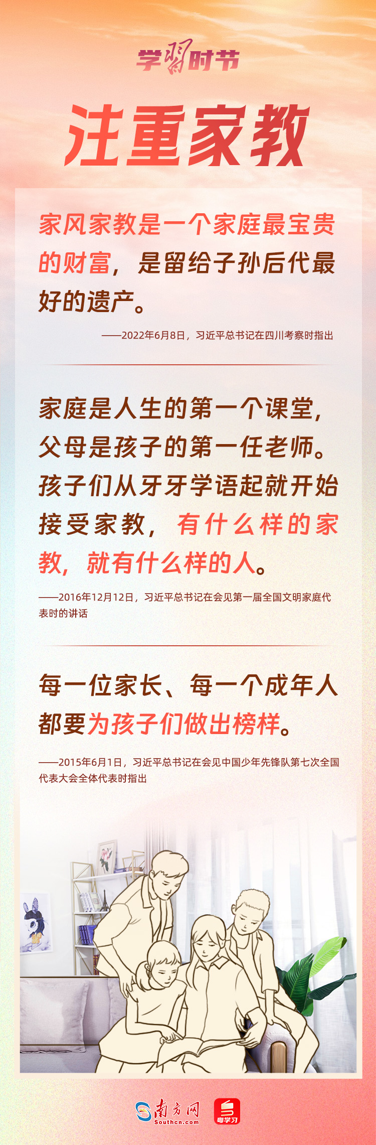 5月15日是國際家庭日。家庭是社會(huì)的細(xì)胞,是國家發(fā)展、民族進(jìn)步、社會(huì)和諧的重要基點(diǎn)。習(xí)近平總書記心中始終牽掛著千家萬戶,高度重視家庭、家教和家風(fēng)建設(shè),強(qiáng)調(diào)不論時(shí)代發(fā)生多大變化,不論生活格局發(fā)生多大變化,我們都要重視家庭建設(shè),注重家庭、注重家教、注重家風(fēng)。家庭和睦、家教良好、家風(fēng)端正,子女才能健康成長,社會(huì)才能健康發(fā)展。