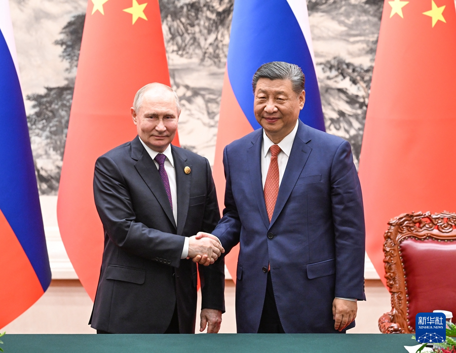 5月16日上午,國家主席習近平在北京人民大會堂同來華進行國事訪問的俄羅斯總統(tǒng)普京舉行會談。這是會談后,兩國元首共同簽署并發(fā)表《中華人民共和國和俄羅斯聯(lián)邦在兩國建交75周年之際關(guān)于深化新時代全面戰(zhàn)略協(xié)作伙伴關(guān)系的聯(lián)合聲明》。新華社記者 饒愛民 攝