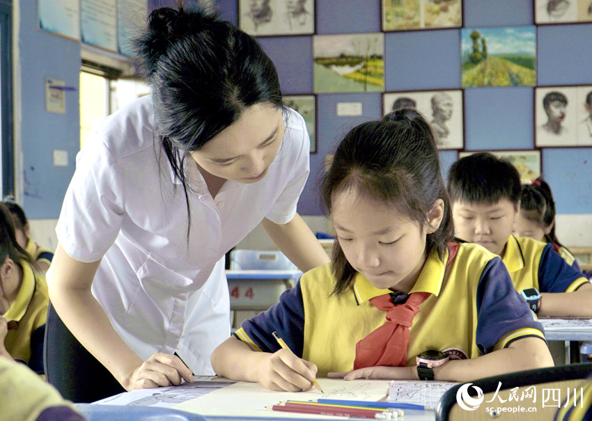5月31日,南充市嘉陵區(qū)之江小學(xué),學(xué)生在老師指導(dǎo)下學(xué)習(xí)繪畫。人民網(wǎng) 趙祖樂(lè)攝