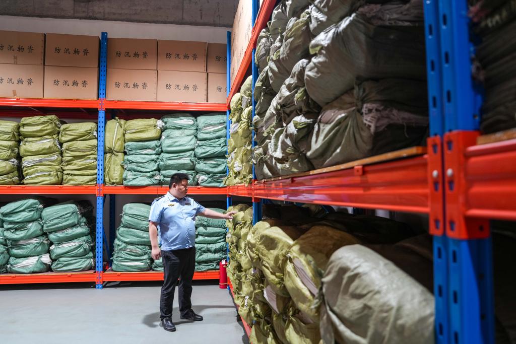 6月18日,在湖南省長(zhǎng)沙市天心區(qū)防汛物資倉(cāng)庫(kù),應(yīng)急管理局工作人員在檢查防汛物資。新華社記者 陳思汗 攝
