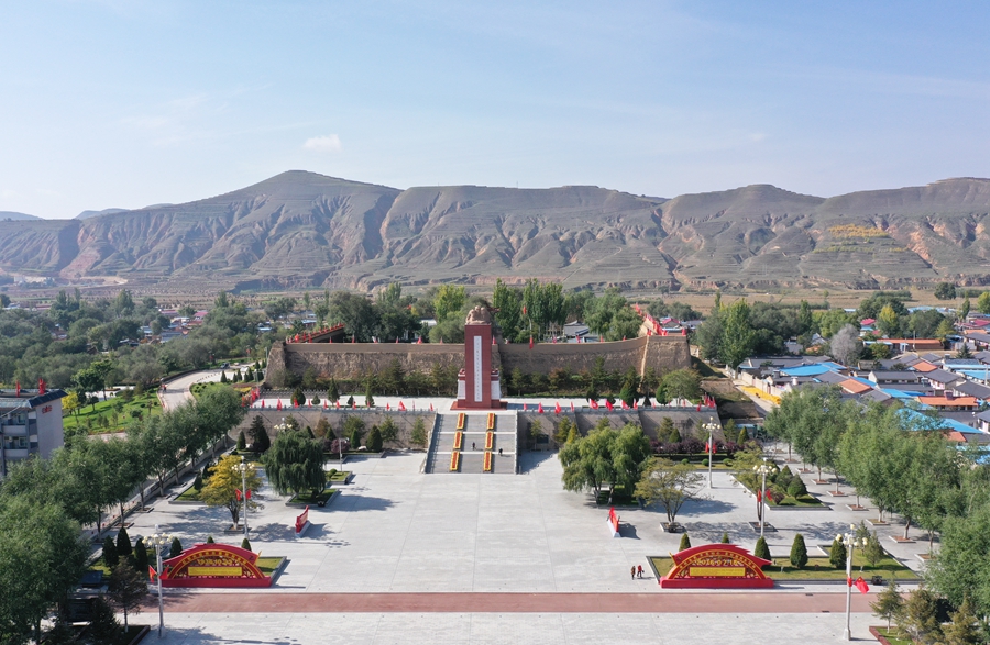 這是位于寧夏固原市西吉縣的將臺(tái)堡紅軍長(zhǎng)征會(huì)師紀(jì)念園(2021年10月18日攝,無(wú)人機(jī)照片)。新華社記者 盧鷹 攝