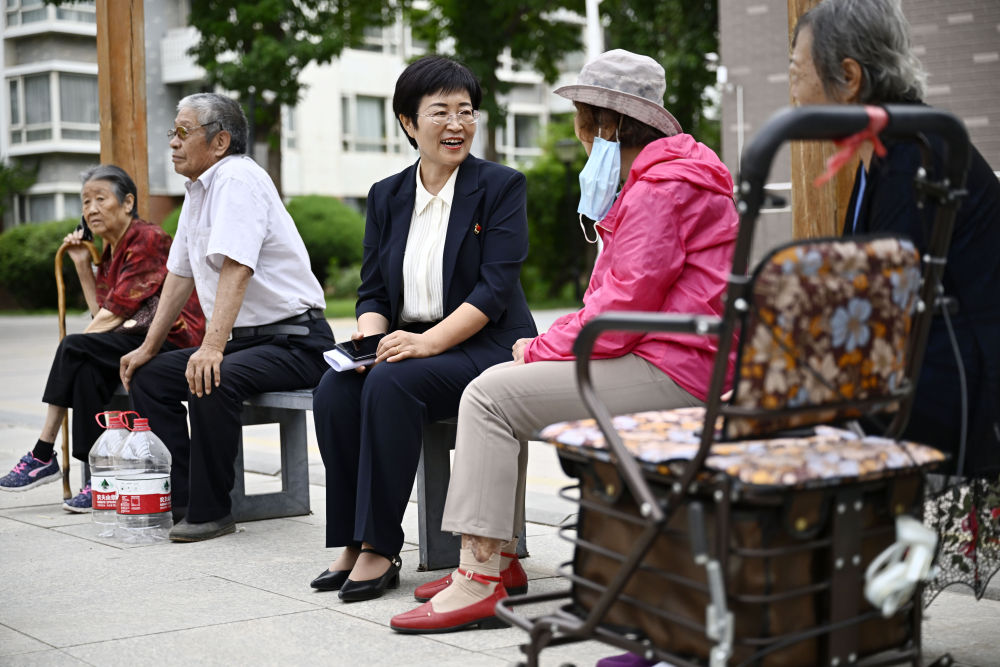 6月20日,寧夏銀川市金鳳區(qū)長城花園社區(qū)黨委書記趙耐香(左三)在社區(qū)廣場(chǎng)與居民交流。