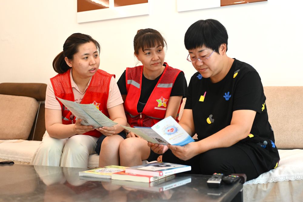 6月20日,寧夏銀川市金鳳區(qū)長城花園社區(qū)志愿者在入戶為居民提供服務(wù)。