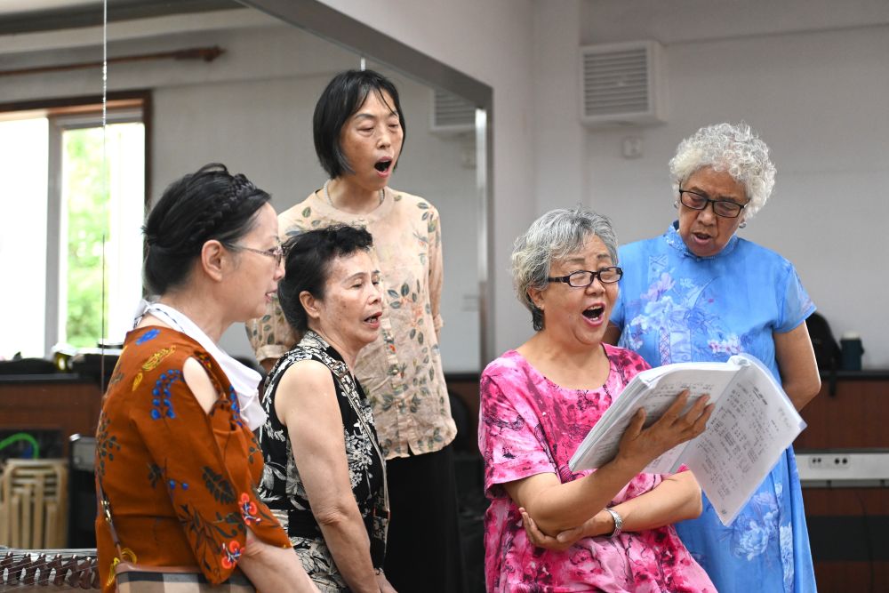 6月20日,長城花園社區(qū)居民在活動室排練節(jié)目。