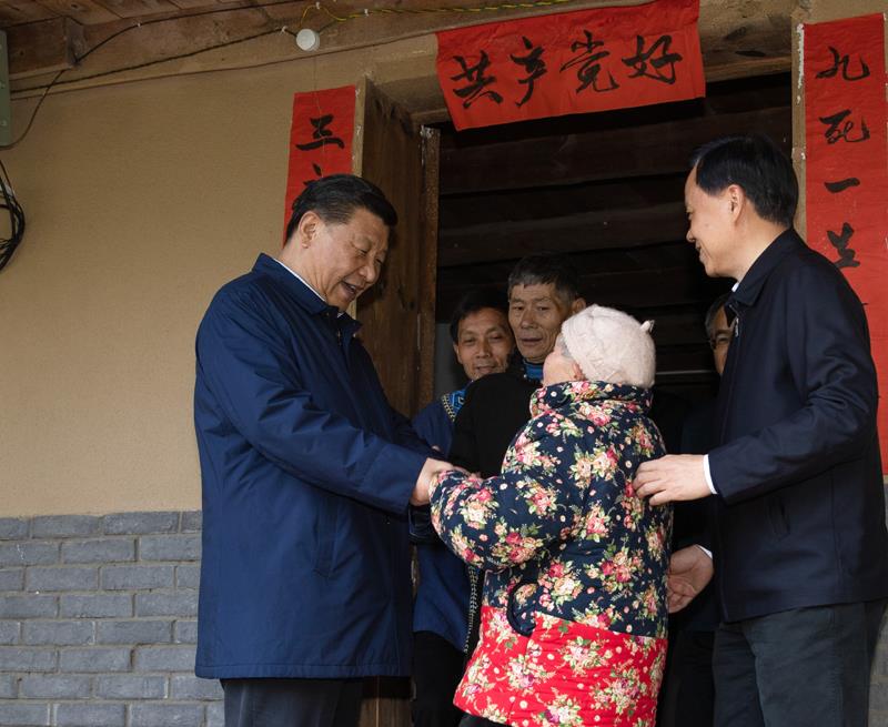 △2019年4月15日,習(xí)近平總書記在重慶石柱土家族自治縣中益鄉(xiāng)華溪村看望貧困戶譚登周一家。
