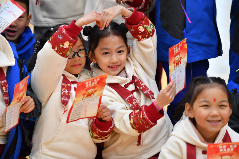 在湖南省長沙市天心區(qū)的湖南師大附中雙語實(shí)驗學(xué)校,一年級學(xué)生在趣味闖關(guān)活動中展示自己的闖關(guān)卡片(2024年1月18日攝)。新華社記者 陳澤國 攝