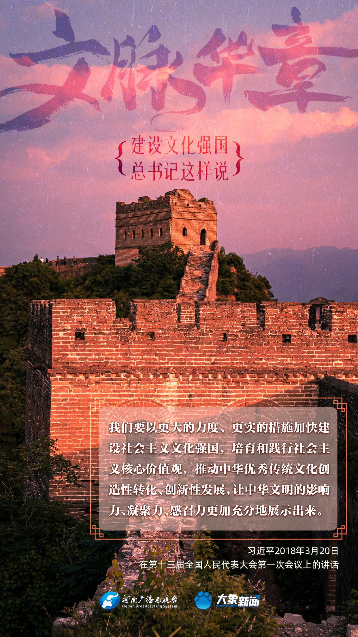 黨的十八大以來,習(xí)近平總書記站在全局和戰(zhàn)略高度,就建設(shè)社會(huì)主義文化強(qiáng)國提出一系列新思想新觀點(diǎn)新論斷,為我們堅(jiān)定文化自信,堅(jiān)持中國特色社會(huì)主義文化發(fā)展道路,提供了指引。大象新聞與您一起學(xué)習(xí)、領(lǐng)悟。