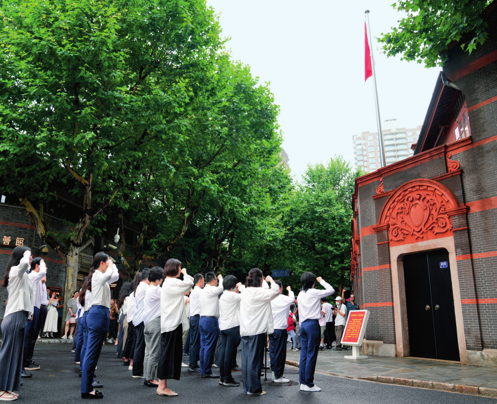 中共一大紀念館的黨員在一大會址前重溫入黨誓詞(2024年7月1日攝) 劉穎攝 / 本刊