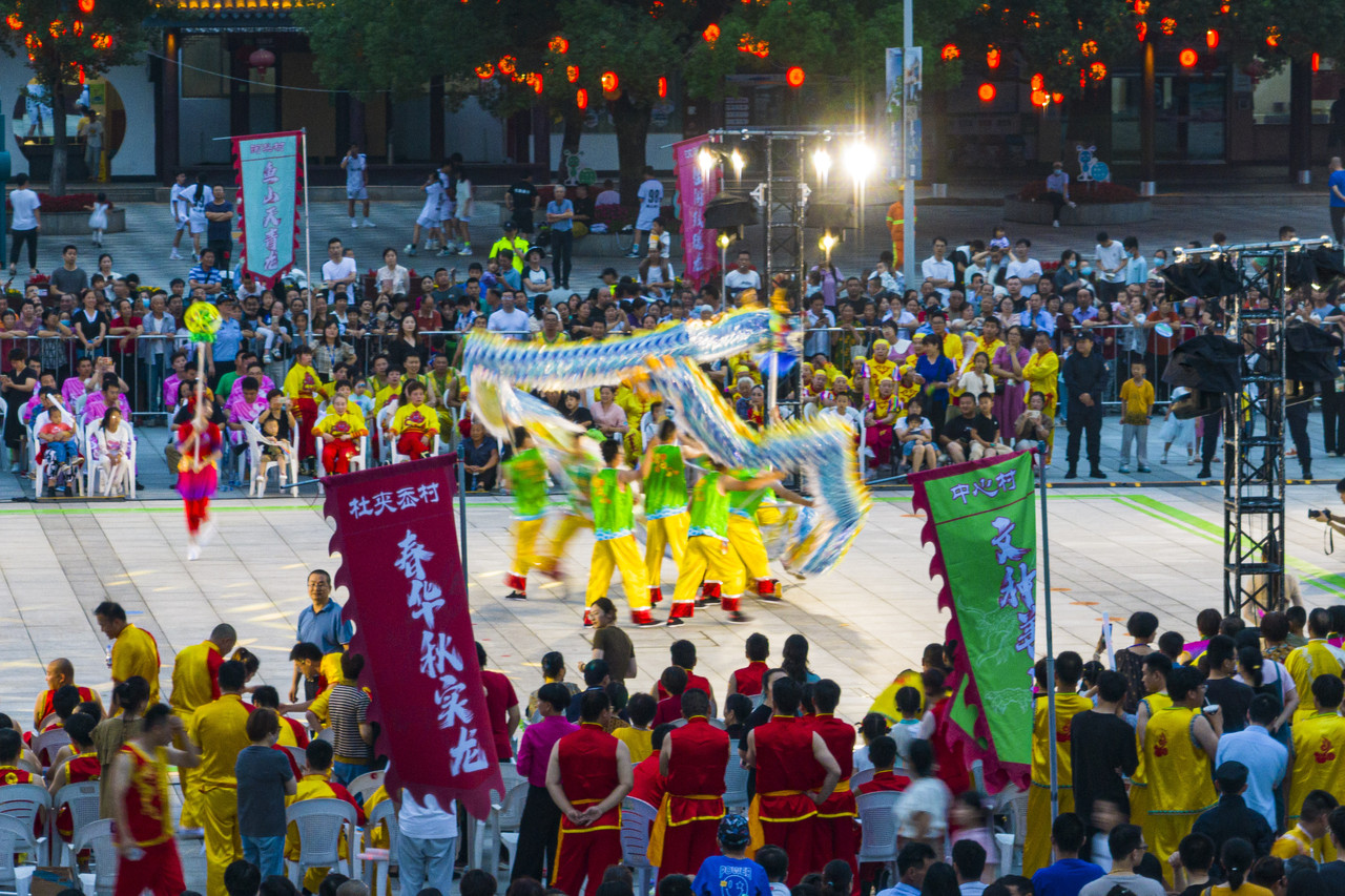 寧波市鎮(zhèn)海區(qū)九龍湖鎮(zhèn),當(dāng)?shù)鼐用褡园l(fā)組成的14支舞龍隊(duì)同臺(tái)競(jìng)技 省農(nóng)業(yè)農(nóng)村廳供圖