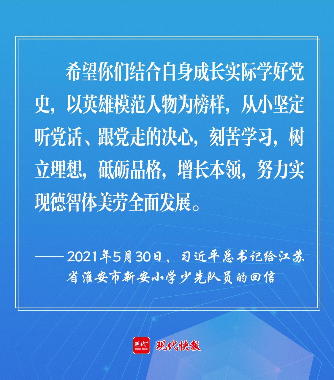 2021年5月30日,習(xí)近平總書記給江蘇省淮安市新安小學(xué)少先隊(duì)員回信時(shí)強(qiáng)調(diào),“希望你們結(jié)合自身成長實(shí)際學(xué)好黨史,以英雄模范人物為榜樣,從小堅(jiān)定聽黨話、跟黨走的決心,刻苦學(xué)習(xí),樹立理想,砥礪品格,增長本領(lǐng),努力實(shí)現(xiàn)德智體美勞全面發(fā)展。”