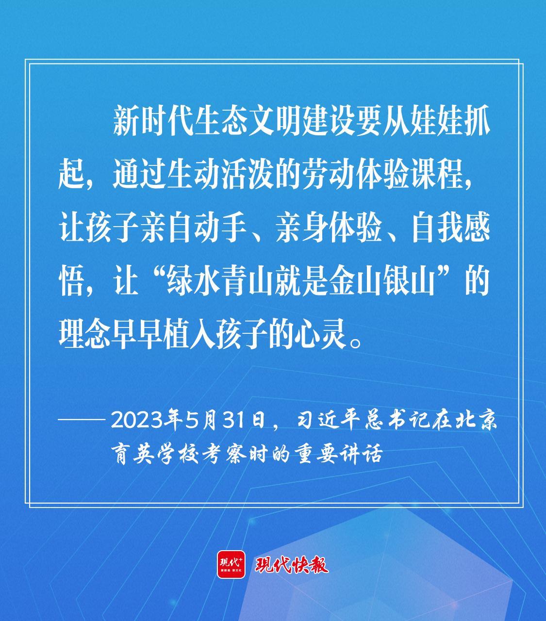 2023年5月,習(xí)近平總書記在北京育英學(xué)校考察時(shí)強(qiáng)調(diào),新時(shí)代生態(tài)文明建設(shè)要從娃娃抓起,通過生動(dòng)活潑的勞動(dòng)體驗(yàn)課程,讓孩子親自動(dòng)手、親身體驗(yàn)、自我感悟,讓“綠水青山就是金山銀山”的理念早早植入孩子的心靈。