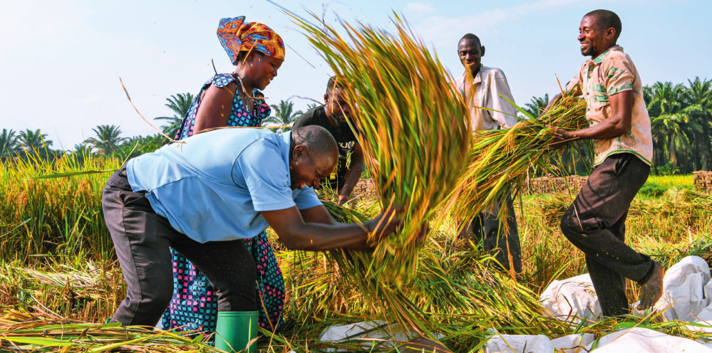 2018 年,中國(guó)農(nóng)業(yè)專家組在布隆迪布班扎省吉漢加縣設(shè)立首個(gè)水稻減貧示范村。圖為當(dāng)?shù)剞r(nóng)戶在稻田里給雜交水稻脫粒(2023年6月20日攝) 韓旭攝 / 本刊