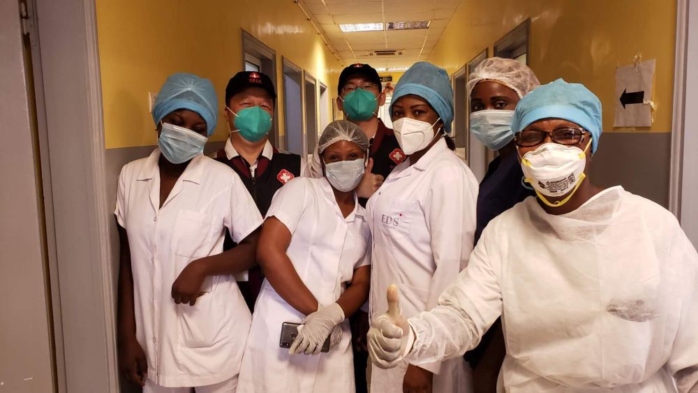 2020年5月26日,在剛果(布)首都布拉柴維爾,中國抗疫醫(yī)療專家組與當?shù)匾痪€醫(yī)務人員交流,指導新冠肺炎病房建設。