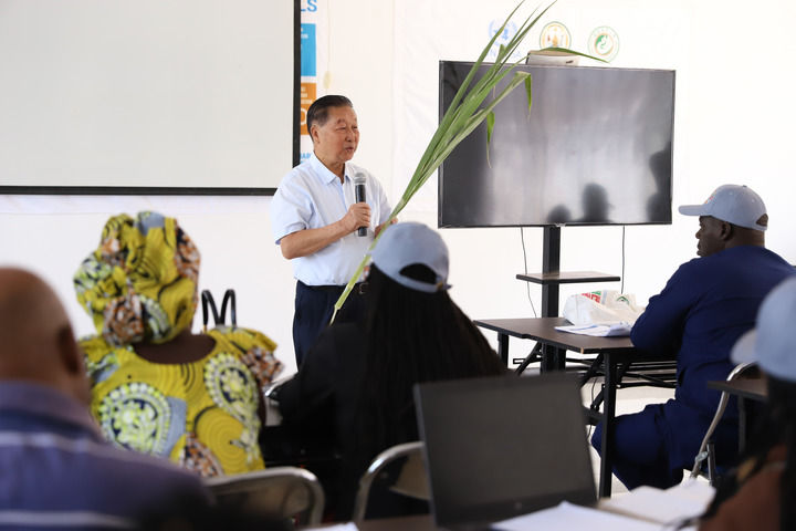 2024年8月4日,在位于盧旺達南方省胡耶區(qū)的中國援盧農(nóng)業(yè)技術(shù)示范中心,菌草發(fā)明人林占熺為培訓班學員講解菌草技術(shù)。新華社發(fā)(黃萬晴攝)