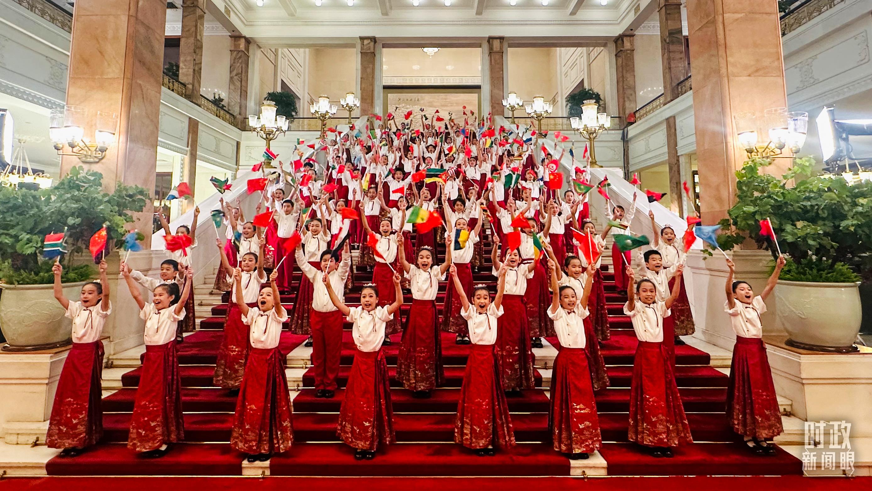 壁畫緩緩打開,百余名身著中國傳統(tǒng)服飾的少年兒童揮舞著旗幟,熱情演唱《把未來點(diǎn)亮》、《歌聲與微笑》、非洲歌曲《Waka Waka》等。