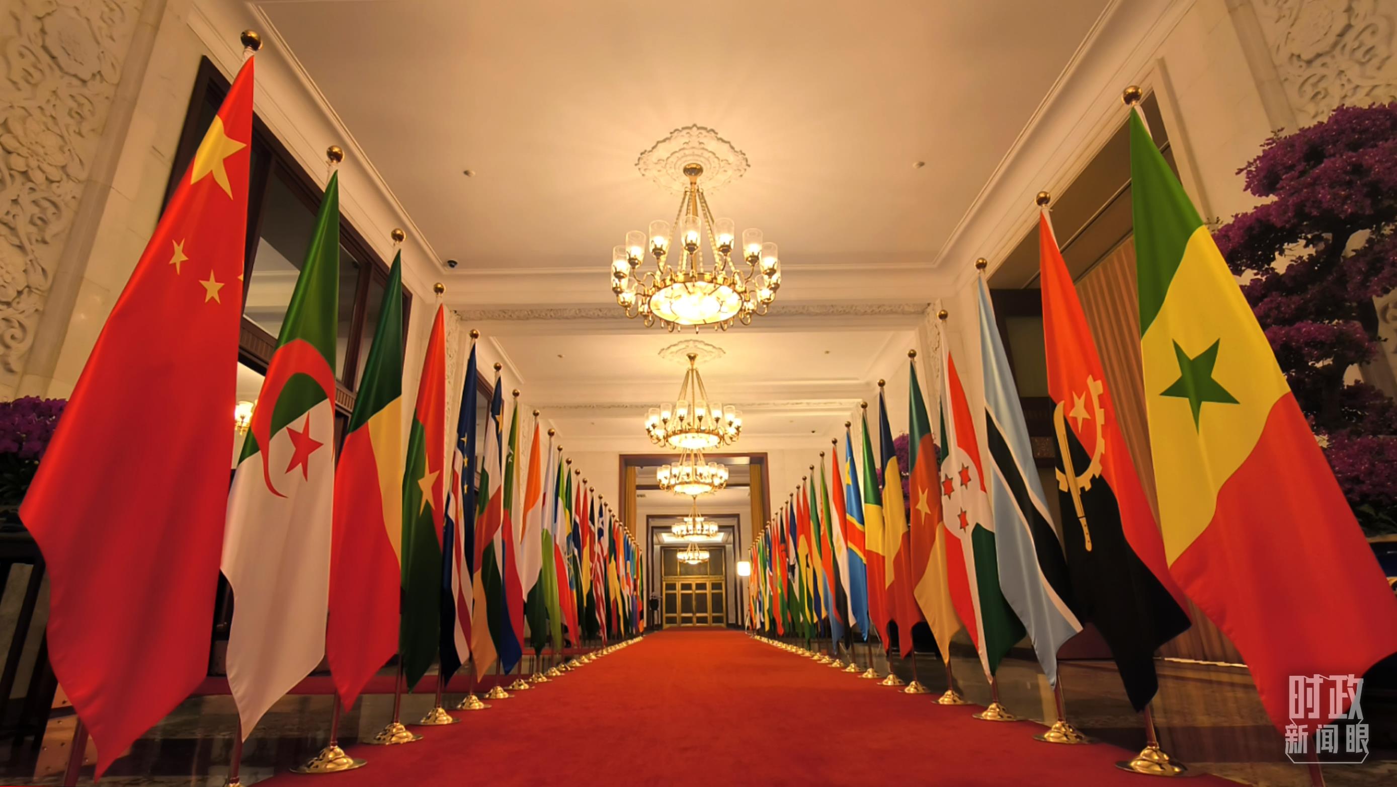 中國國旗和中非合作論壇成員國國旗以及非洲聯(lián)盟旗幟交相輝映。(總臺(tái)央視記者范凱拍攝)