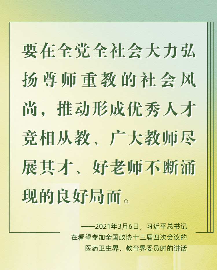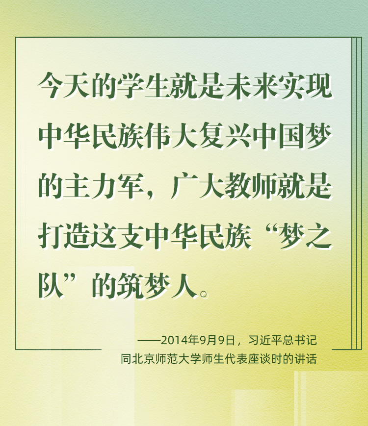 教師是立教之本、興教之源。2024年9月10日,是我國第40個(gè)教師節(jié)。黨的十八大以來,習(xí)近平總書記始終高度重視教師隊(duì)伍建設(shè),立足實(shí)現(xiàn)中華民族偉大復(fù)興中國夢(mèng)、打造中華民族“夢(mèng)之隊(duì)”筑夢(mèng)人的特殊歷史使命,對(duì)教師相繼提出了“四有好老師”“四個(gè)引路人”“四個(gè)相統(tǒng)一”“大先生”等殷切期望和明確要求。